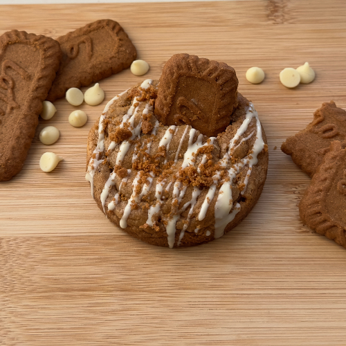 Ingrédients : farine de blé, beurre, vergeoise, sucre blanc, œuf, spéculoos (farine de blé, sucre, huiles végétales, cannelle), chocolat blanc (sucre, beurre de cacao, lait en poudre), crème, bicarbonate, sel.
